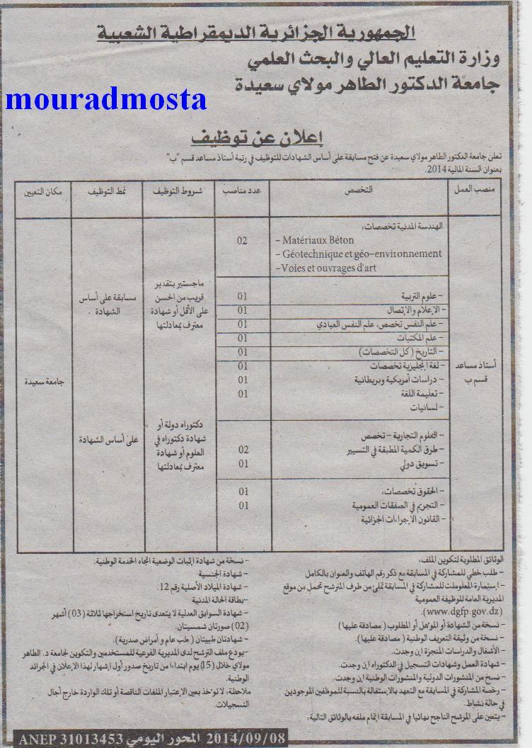 جامعة الدكتور الطاهر مولاي بسعيدة توظف أساتذة مساعدين قسم ب